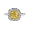This cushion~cut yellow diamond double halo ring is a romantic fusion of sunlight and starlight, known as the "Kiss of the Sun" in the world of colored gemstones.