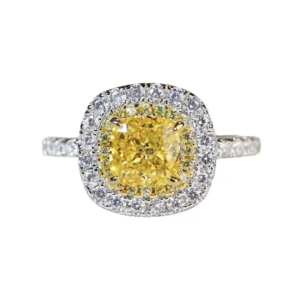 The square cushion shape symbolizes unwavering commitment for a lifetime; the radiance of the yellow diamond represents an exceptional, on·ei~na~million affection. It serves as a sincere proposal declaration, a heartfelt anniversary gift, and an eternal promise worn on your finger~to "forever guard your radiance and pride". Witnessed by the yellow diamond and sealed by the crown design, may this timeless beauty become the most precious footnote of your life.